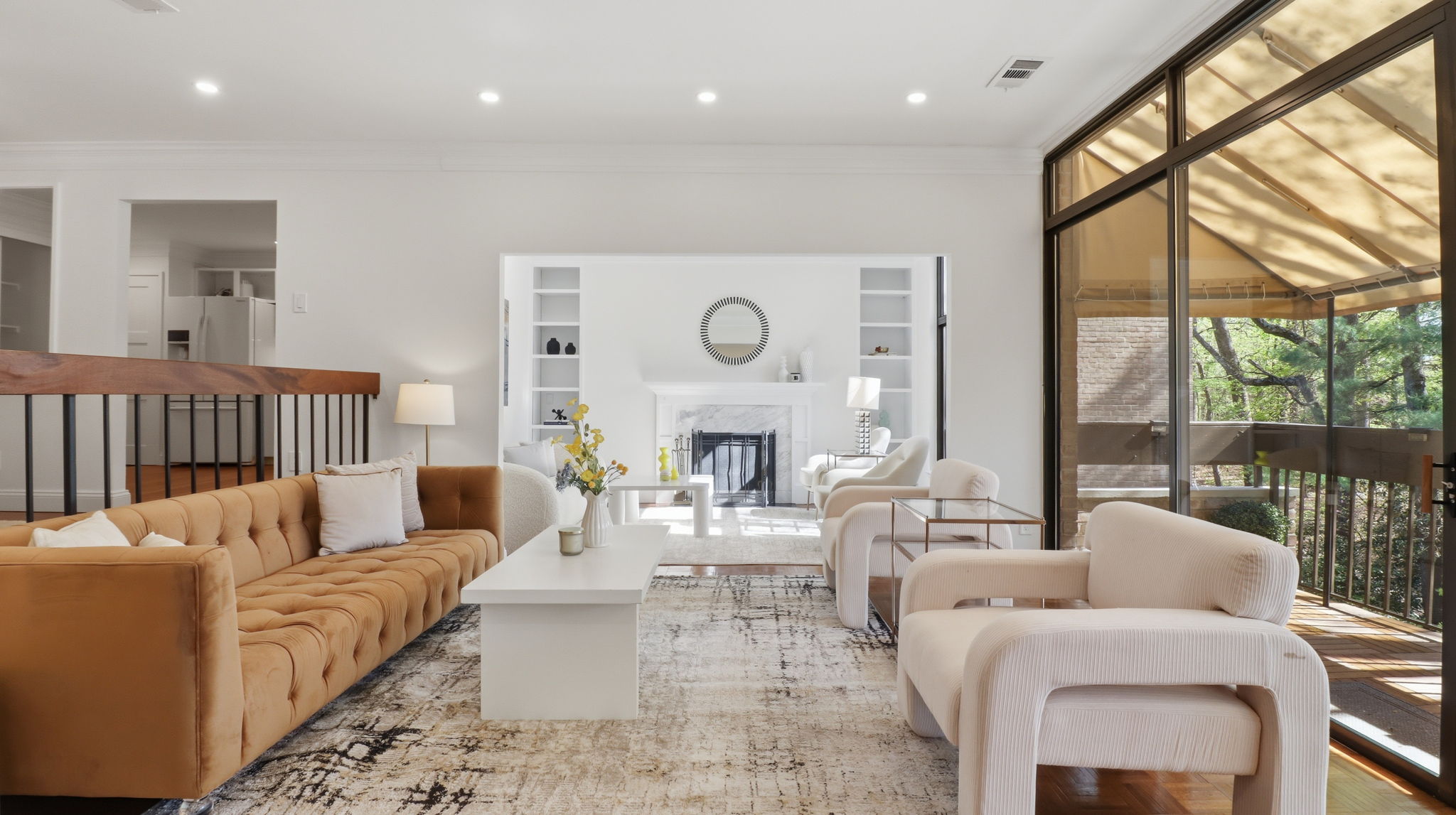 At the heart of the home, the living room opens to a large private balcony with new Trex decking and a newer awning—perfect for relaxing or entertaining above the lush interior gardens. Just off the main living space, the spacious den features a wood-burning fireplace with custom built-ins, creating a cozy yet refined setting for a home office, reading lounge, or additional seating area.